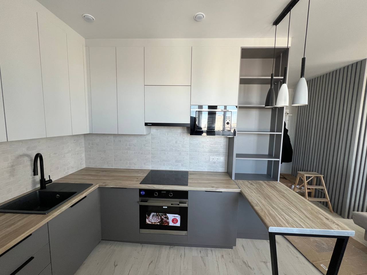 Кухня угловая — Серый глянец, белый и дерево: детали и особенности