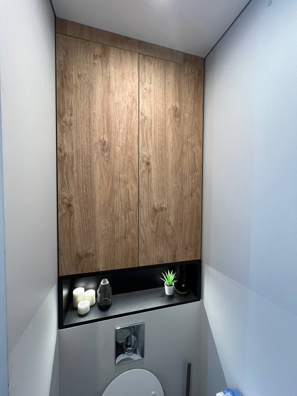 Встроенный шкаф для санузла с деревянными фасадами и чёрной нишей