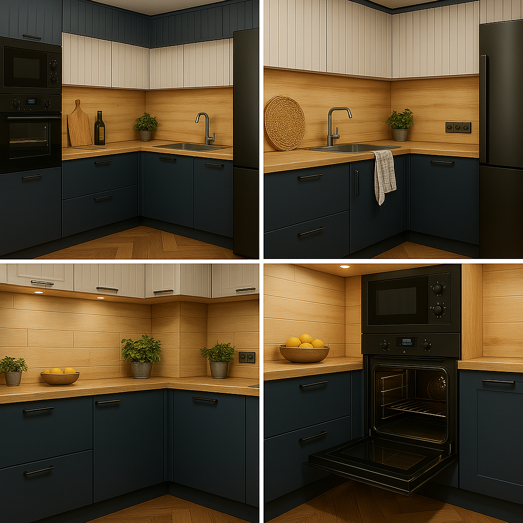 Зависит от размера, материала фасадов и комплектации. Прямые — от 120 000 ₽, угловые — от 180 000 ₽. Точную стоимость считаем бесплатно после замера или по вашим размерам.