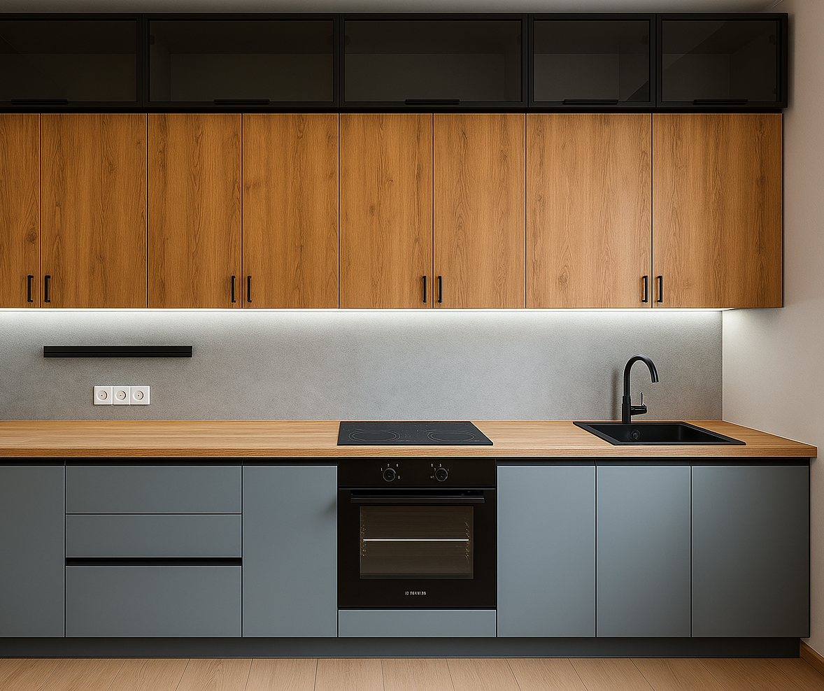 Зависит от размера, материала фасадов и комплектации. Прямые — от 120 000 ₽, угловые — от 180 000 ₽. Точную стоимость считаем бесплатно после замера или по вашим размерам.